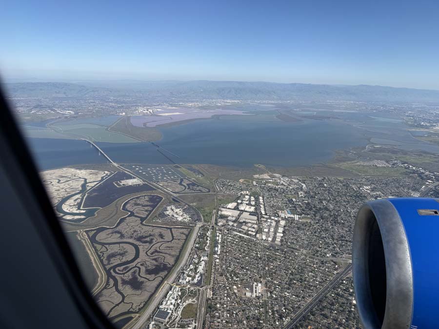 The picture below is my airplane descending to land at SFO (San Francisco Airport). The bridge over the bay in the photo is Dumbarton Bridge. I lived in this area for 30 years and it is nice to see the familiar landmarks again.