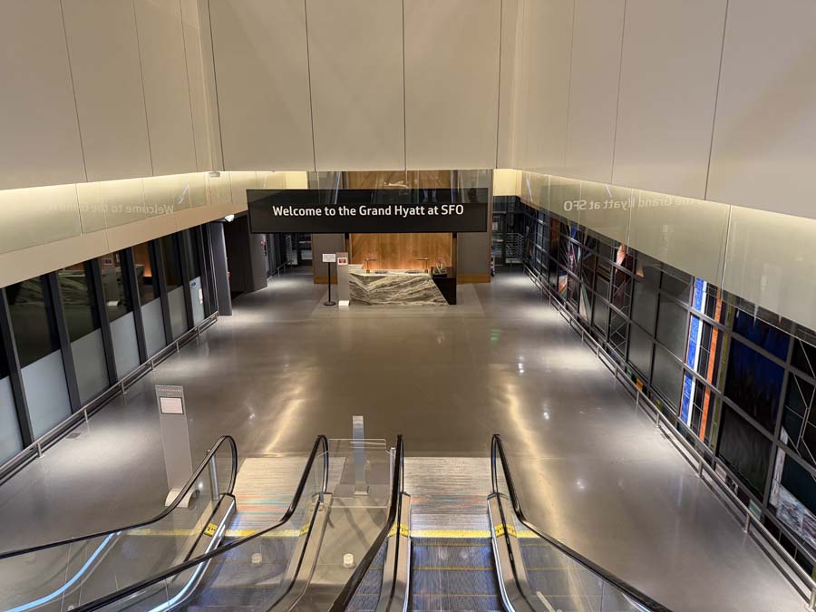The AirTrain runs about every 3 minutes, 24 hours a day, and the Grand Hyatt at SFO has a dedicated AirTrain stop. Here I am descending from the train platform into the front lobby.