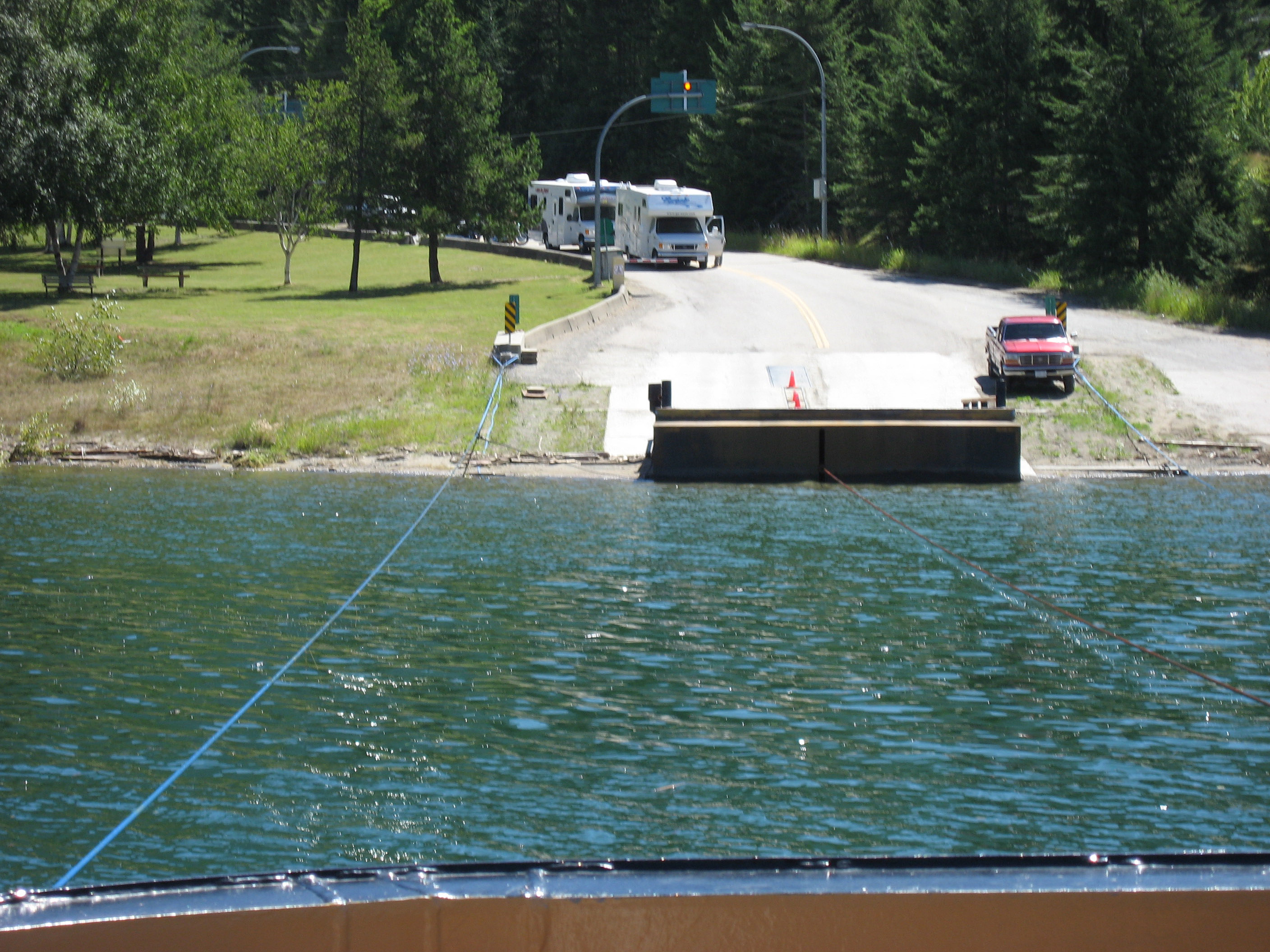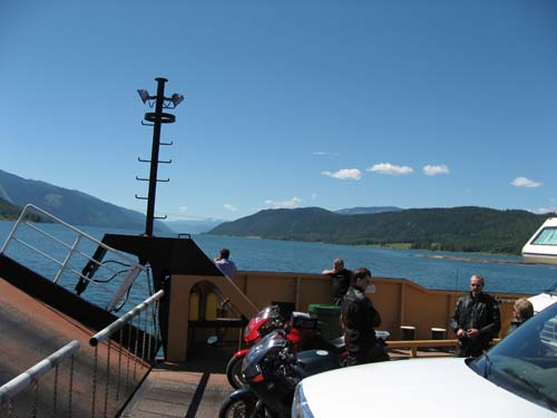 Different picture of the Needles Ferry (mid-way across the lake) in British Columbia, Canada. You can see the other motorcyclists in front.