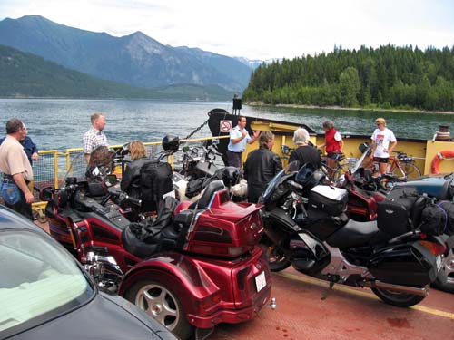 Here is the crowd of motorcycles, mid-lake on the Galena Bay Ferry in British Columbia, Canada. Notice the "Trike" in the foreground. It is a modified Honda Goldwing with a 1500 cc engine made into a "Trike" (3 wheeled motorcycle) by a company called Lehman.