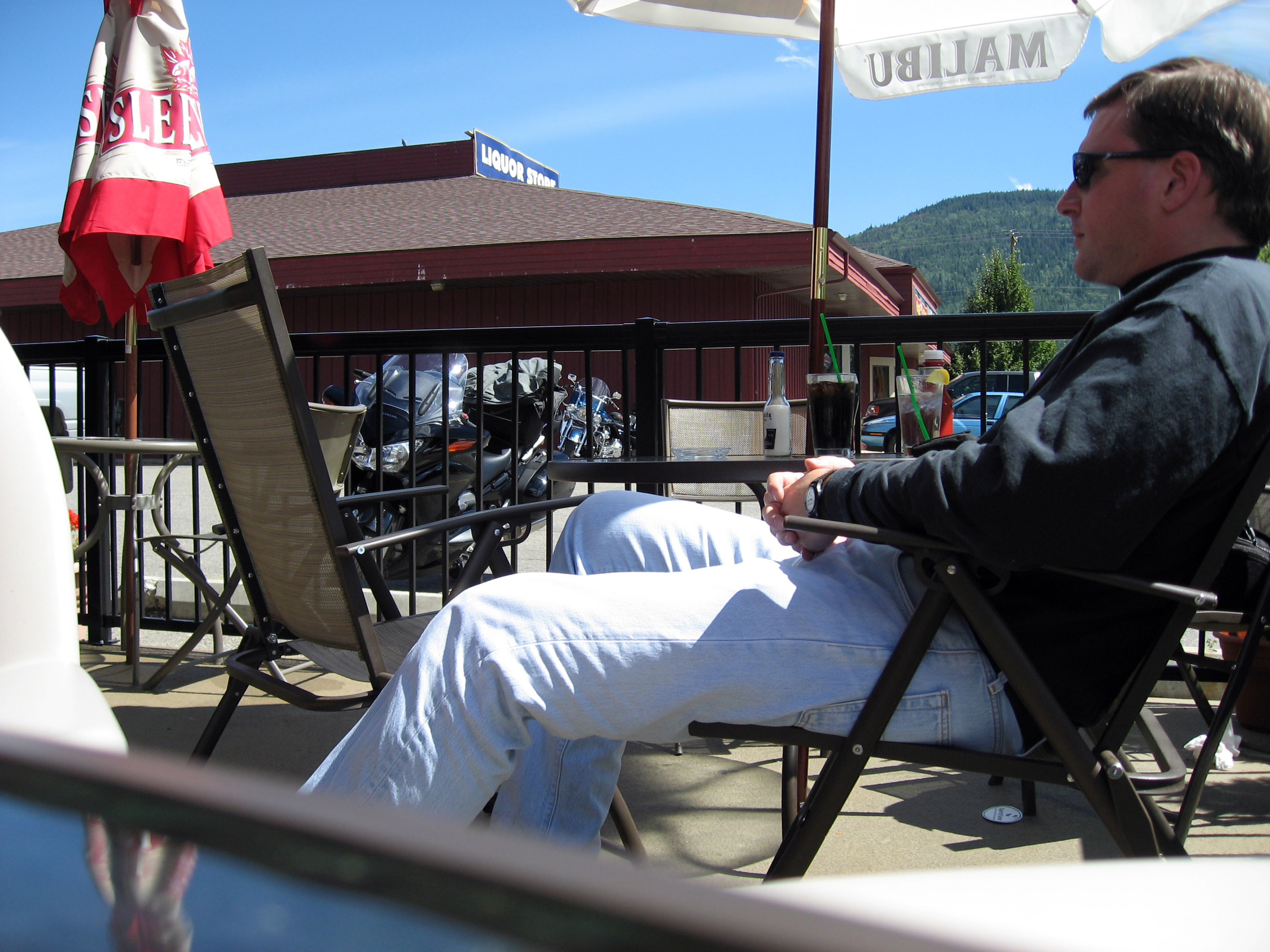 A couple hours later, I broke for a late lunch at Salmon Arm, a small town in British Columbia, Canada (marked on the map above as "D"). It is almost 3pm at this point (I left at 8:30am). This is a picture of my table outside, with my motorcycle behind it.