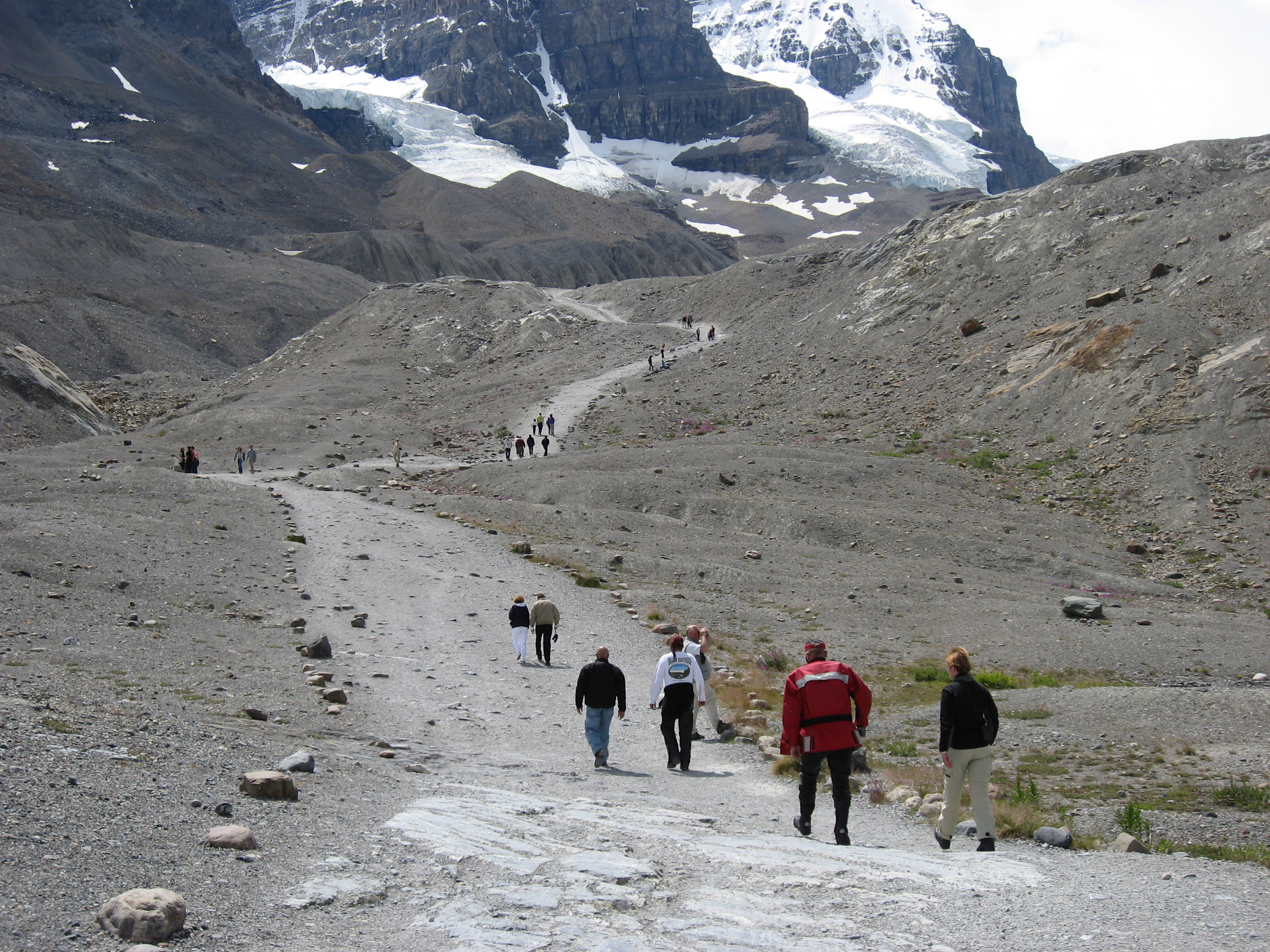 Standing on the Athabasca Glacier in Canada looking back down the hill at all the people wandering around on it.