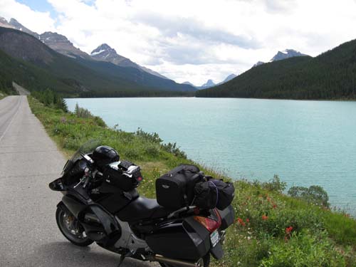 Back on the motorcycle down the road a little, I saw several of these BRILLIANT colorful blue/green/turquoise lakes. I cannot seem to capture the right colors with the pictures, but they are very pretty. The color is caused by all the minerals in the water, which come from runoff from the glaciers. The minerals come from the glaciers grinding up the rocks into a fine powder as they flow along.