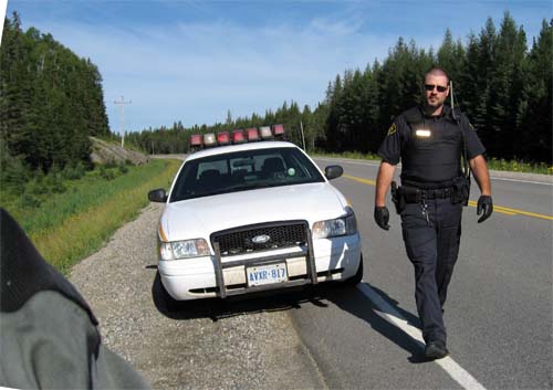 This is the first time I've ever dealt with Canadian police, and he was super polite and seemed honestly concerned about me. The problem on the north side of Lake Superior and elsewhere in Ontario is they have LOTS of casualties from cars colliding with moose on the highways. To solve this, the speed limits are a little lower around here (D'oh!) at 80 kph and 90 kph instead of the normal 100 and 110 kph that is common elsewhere in Canada. I took the picture below as the officer wrote me up for going 110 kph in the moose-zone speed limit of 90 kph. (Good think he didn't catch me *AFTER* my morning coffee, I'm usually going a little faster. :-)