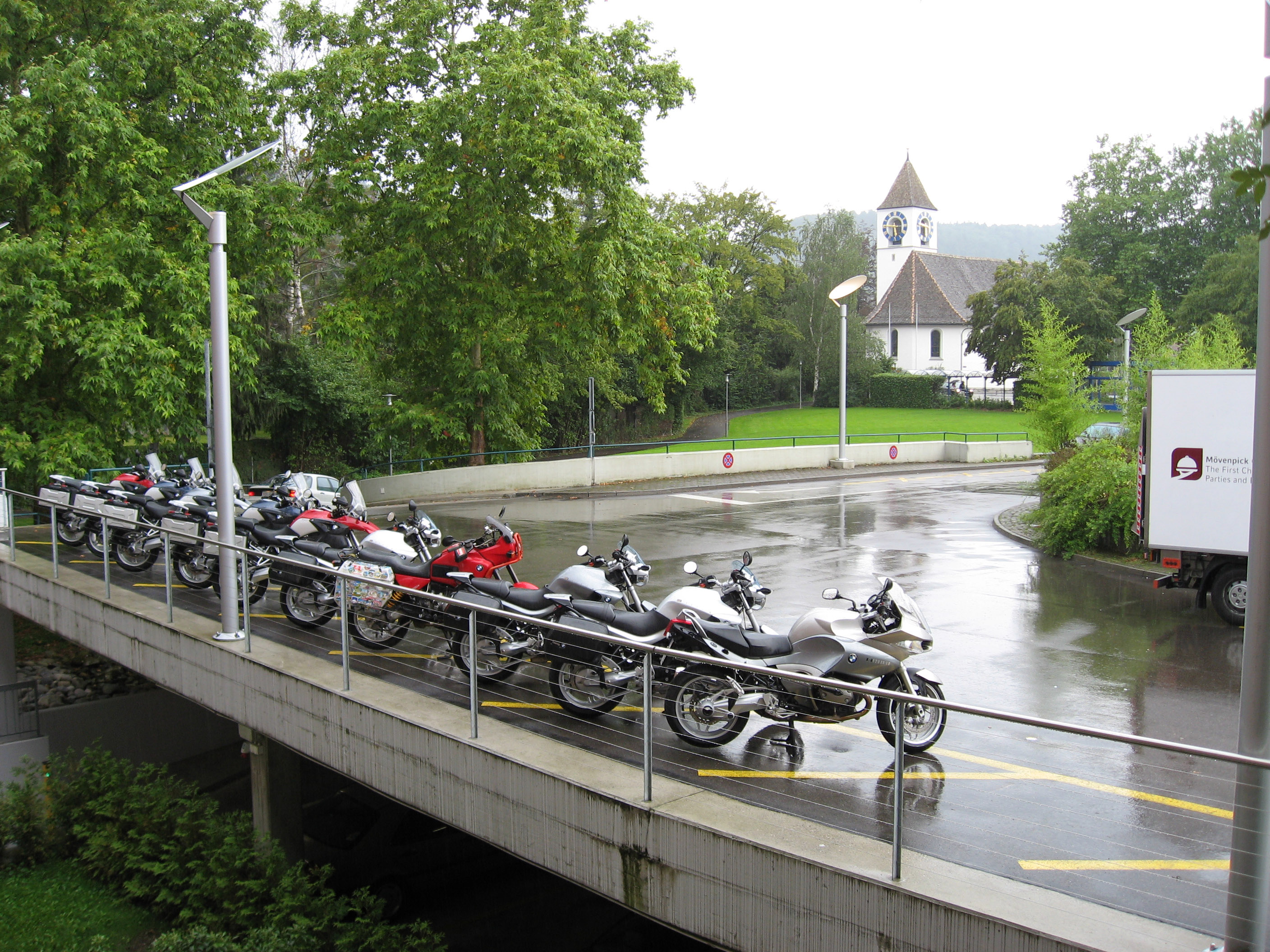 I arrived into Zurich, Switzerland the morning of Saturday, 8/26/06. On these trips we don't ride motorcycles for the first day or two while we get over jet-lag. This is the view out my hotel room window of the line of motorcycles our tour group will be riding for the next two weeks. A note on motorcycle selection-> in general you can choose any BMW motorcycle you like, you let the tour guide know in advance and he has it ready for you upon arrival. I choose the 2006 BMW R1200GS because it is tall and more comfortable for me, and also because it handles some of the smaller gravel roads well. The gravel roads are "avoidable", but sometimes there is some good riding just past some gravel or dirt.