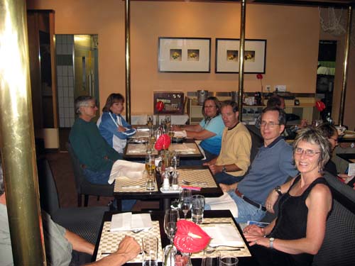 Our first group dinner together. Dinners are included in the one price of the motorcycle tour, and the dinners are usually in the the hotels we stay in (which are chosen to have excellent food). Below are all the tour members on our motorcycle tour on the first night. From left to right we have somebody hidden by pole, Gary Maenpaa, Denise Maenpaa, then across the table Anna Fontaine, Donald Fontaine, my buddy BrianB (Brian Beach) in blue shirt, and finally far right in black is Sarah Walker (Virtual Sarah).