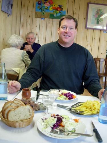 The picture below is of myself at lunch, and a few of the courses, we had to turn down desert and coffee that came with the meal because we were so stuffed. French food is GREAT, even in the remote mountain passes. Picture by BrianB.