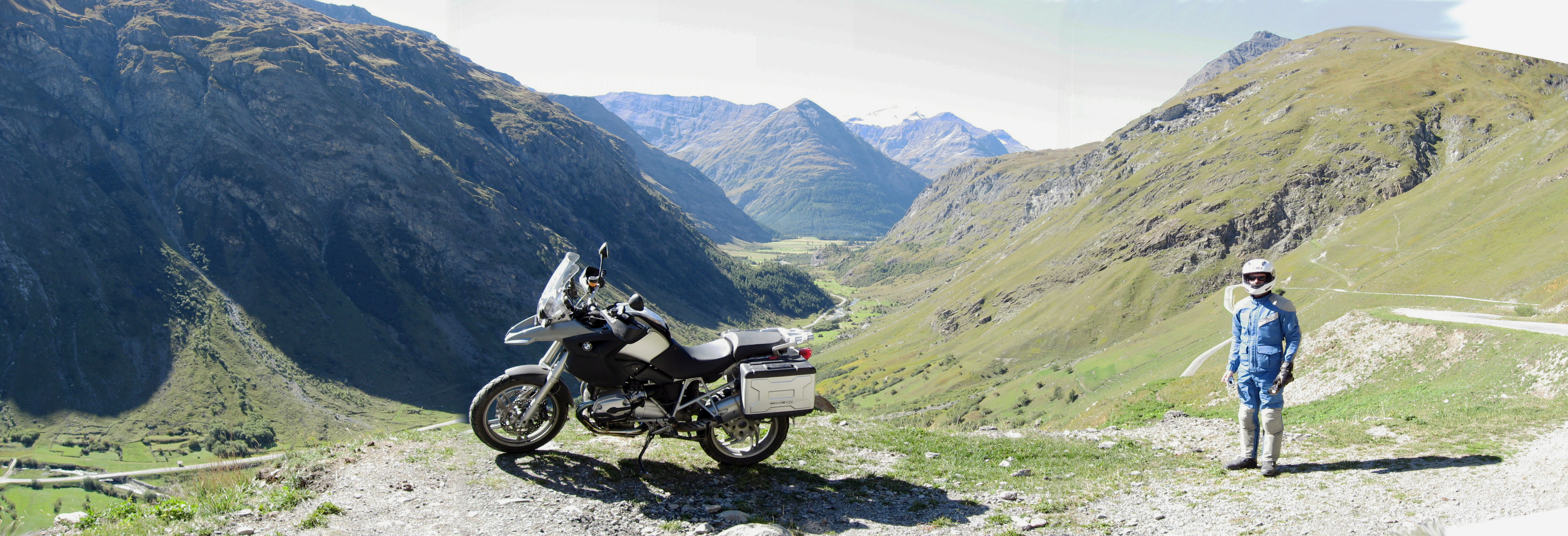 We just started the climb out of the valley up to Col de L'iseran, France when we stopped at this outcropping to take some pictures. I parked my 2006 BMW R1200GS precariously on this cliff, that's BrianB on the right.