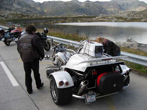 At the top of Saint Gottard Pass, I saw this motorcycle trike with a little doggy in a pet carrier on the top! How neat, I wish I could bring a dog along on all my motorcycle rides!