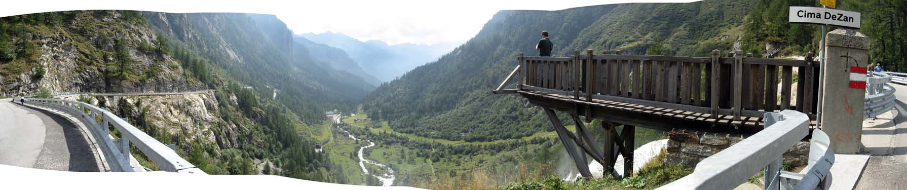 The picture below shows the rocky terrain on the left, and scroll to the right to see the wood platform out over the waterfall. We just came up that valley (Formazza Valley, Italy) that stretches back into the distance.