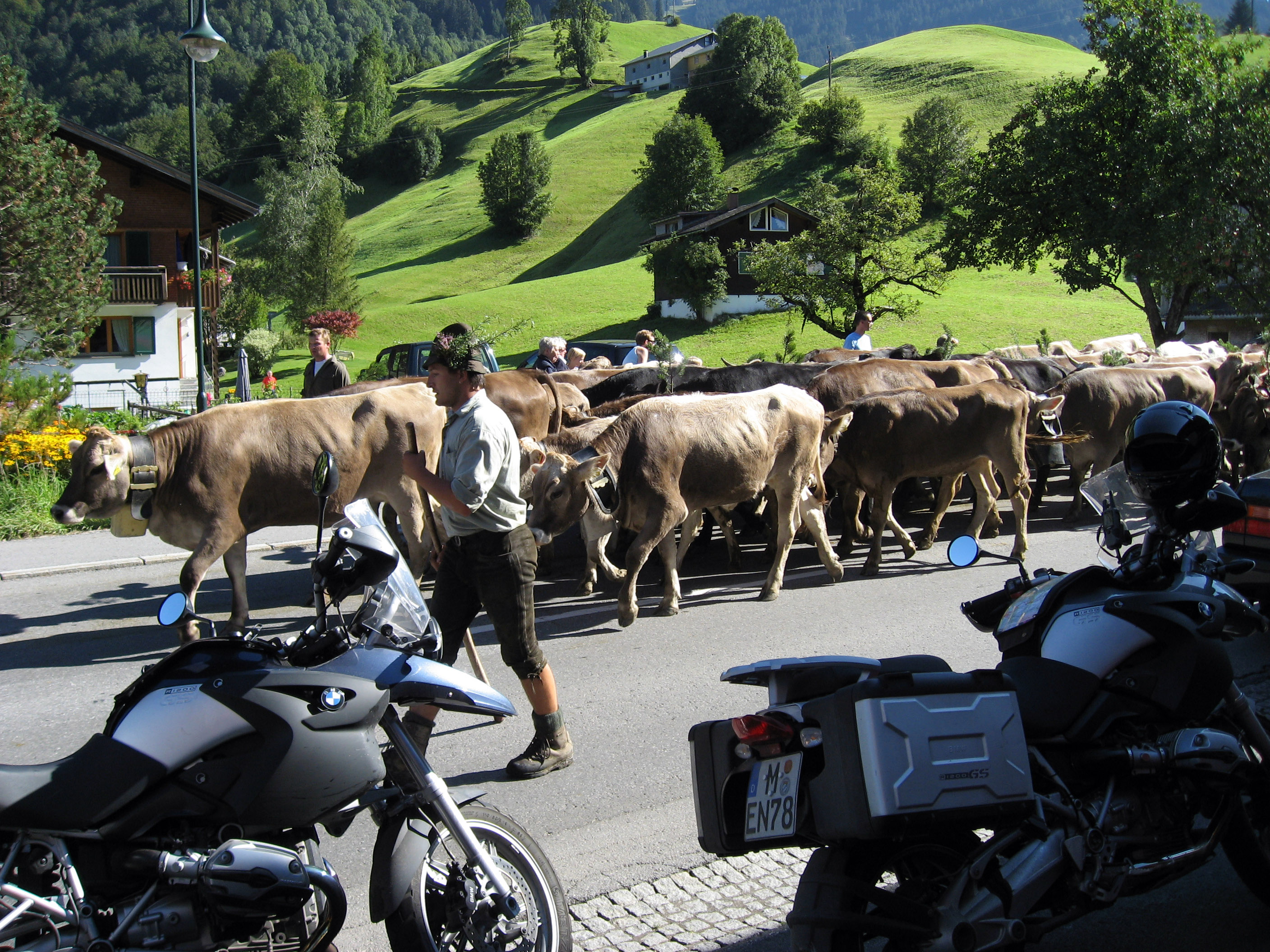 A little further on, maybe 11am, we ran into an annual Austrian festival where they celebrate bringing the cows down from the summer pastures down lower into the winter pastures. We had to pull off to the side of the road to let a bunch of DRESSED UP COWS and goofy Austrians saunter by. Below are the cows approaching.