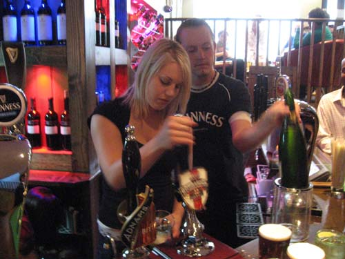 There are these "traditional beer taps" in England where the bar tender must physically pump the tap to get beer to come out. The picture below isn't great, but it shows one of these taps in operation. The blonde woman is pumping by pulling the long handle towards her.