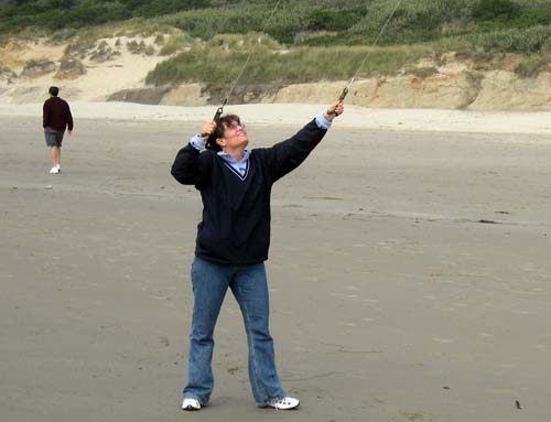 One of the kites we were flying is a 6 foot wide wing kite with two control lines and no "sticks" in it, it is like a paragliding wing. The wnid was blowing at around 25 mph, and it was at our very limits to hold onto the kite and not have it pick us up and throw us down the beach. :-) It was very fun. Below is Mark flying the big wing kite.