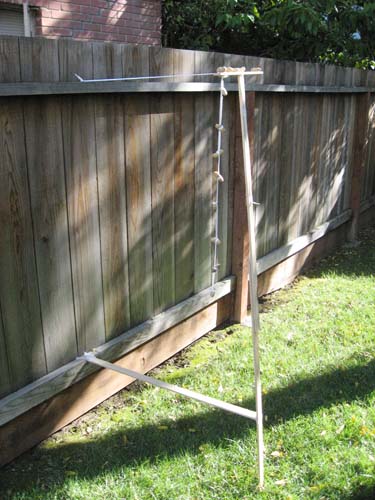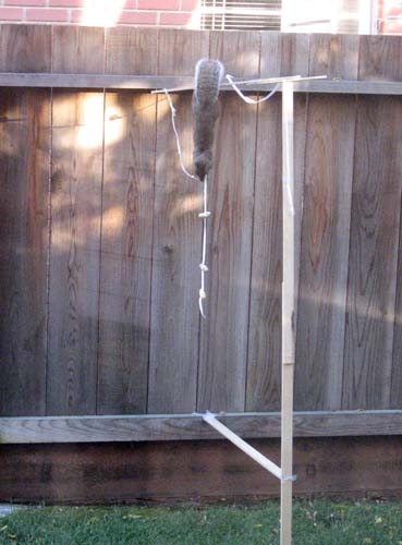 Below is a close up. The squirrel can't get to the top of the pole, but he can still reach horizontally out and get the shoelace, which is not what we intended.