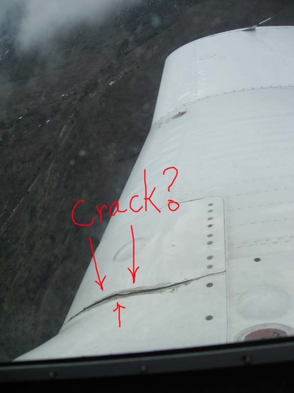 Below is a close up picture of the crack in the airplane wing. It got wider at altitude. You can also see they applied some car "bondo" to try to repair the crack or maybe keep water out, but it ripped back open (not surprising, bondo is for cosmetic repairs on cars, not for airplanes).