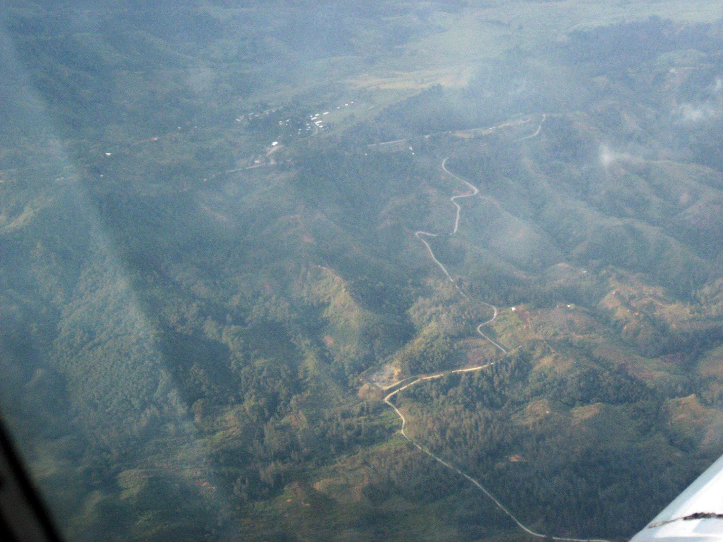 Below is rugged highlands of Papua New Guinea, with some villages and roads.