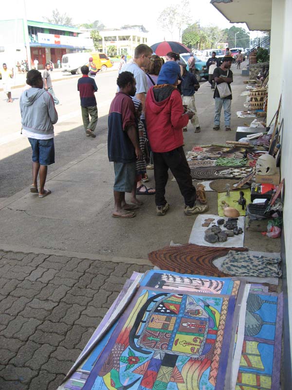 A local artist was doing political type paintings on canvas in a traditional Papua New Guinea story type. Below our family is looking at the various "political cartoons".