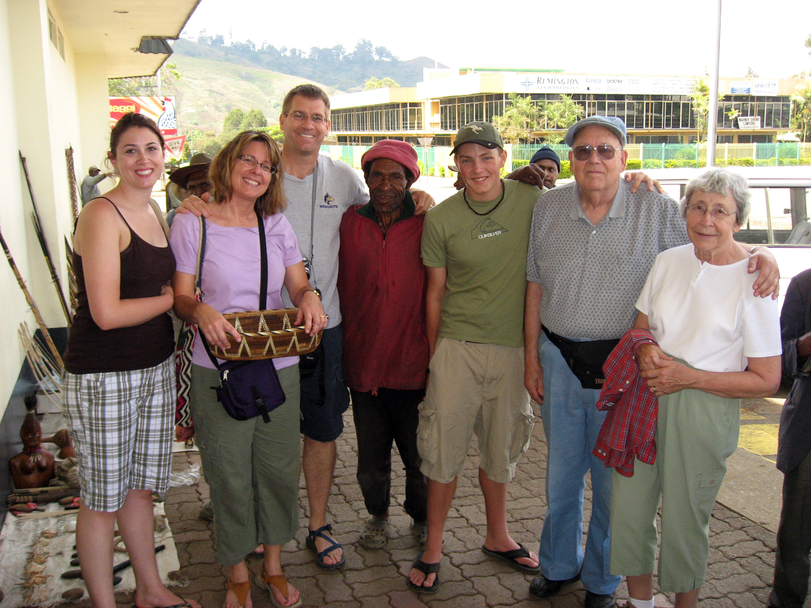 Below is the Hoffmann family posing with Peter at the end of the day. The explanation behind Peter is that he was selling things outside the Bird of Paradise hotel in Goroka, and when we didn't buy anything the first day Peter just decided to walk along with us. At first I wasn't sure why, but after a while it became clear that Peter was along to make sure we were Ok and didn't get lost and avoided any dangerous situations. Peter could clearly see we didn't "fit in" in Goroka. :-) Peter took EXCELLENT care of us and walked all the way down to the market two days in a row with us. Our family appreciated his guidance and his friendliness, and bought a couple of his wares at the very end (including Nathanael's stone axe). In our short trip we met several people like Peter that really went out of their way to help us out. My impression is that the nationals of Papua New Guinea are actually a little SHY (not unfriendly) at first if they haven't been exposed much to foreigners, but after we had been around a couple days we would get friendly waves and hellos from people we had met just the day before. On a cautious note for travelers, there are ALSO a few hard-looking young (early 20s) men around I didn't like the look of, and sometimes Peter seemed to agree judging by how he would scoot us along out of the area.