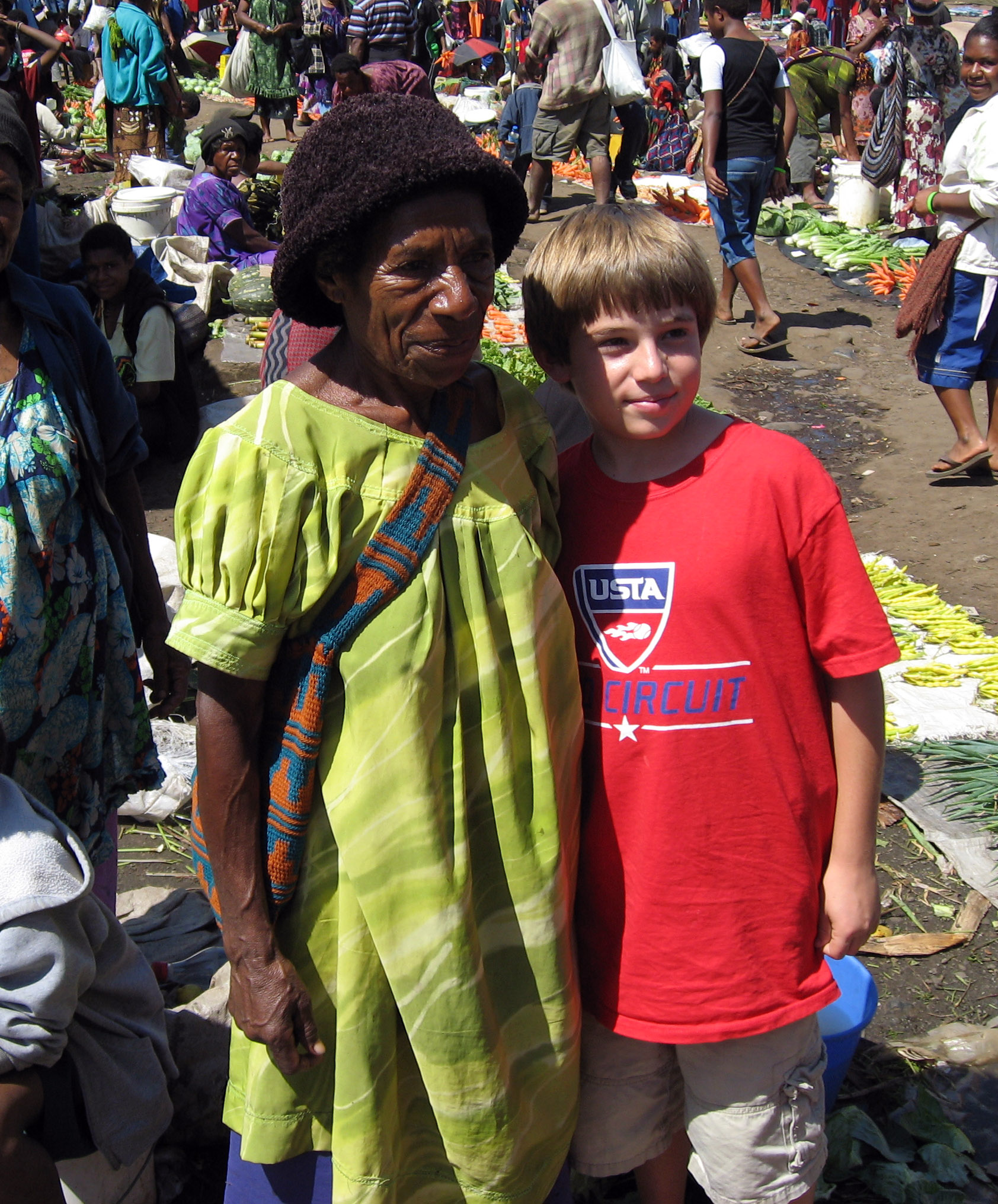 The morning of Sunday, July 27th, the Hoffmann family went off to church in the morning and the Echt-Wilson family decided to catch up by visiting the Goroka market. Below is Eli examining a boar tusk necklace out front of the Bird of Paradise hotel on the way to market.