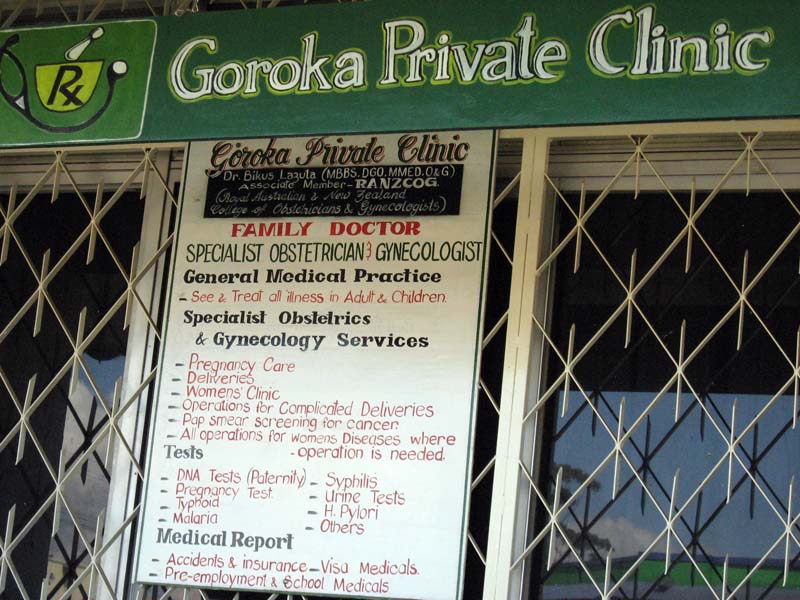 Right near the Bird of Paradise is the "Goroka Private Clinic". It says Dr. Bikus Lazula is a member of RANZCOG (Royal Austalian & New Zealand College of Obstetricians & Gynecologists). They offer generalized treatment, specifically mentioning pregnancy care, deliveries, pap smear screening for cancer, and surgical operations. They offer tests for various things such as malaria, pregnancy, typhoid, syphilis, etc.