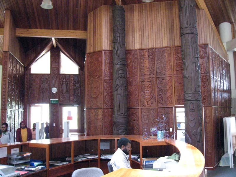 The inside of the entrance of the library at University of Goroka. It is ALSO carved with traditional Papua New Guinea carvings and decorative poles.