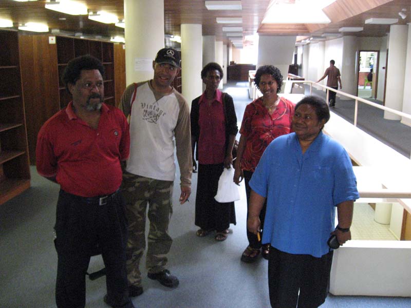 Dr. Lynus Yamuna (in red), John Rupa, and three of the librarians. The woman on the far right (?name?) in blue is the head librarian at the University of Goroka.