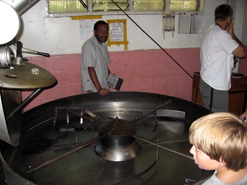 ON TO THE NEXT TOUR STOP -> A coffee factory! Coffee has become big business in the Papua New Guinea Highlands, and around Goroka in particular. We took a quick informal tour of the Arabicas Coffee Factory just outside of Goroka (near the airport). This factory buys small amounts of coffee beans from local growers, piles them together, cleans them, dries them, then roasts them, and exports them to places such as Starbucks Coffee in the USA. I had local Goroka coffee every morning on our trip here and it is EXCELLENT coffee!! Below is Ari mugging for the camera by the Arabicas delivery van.