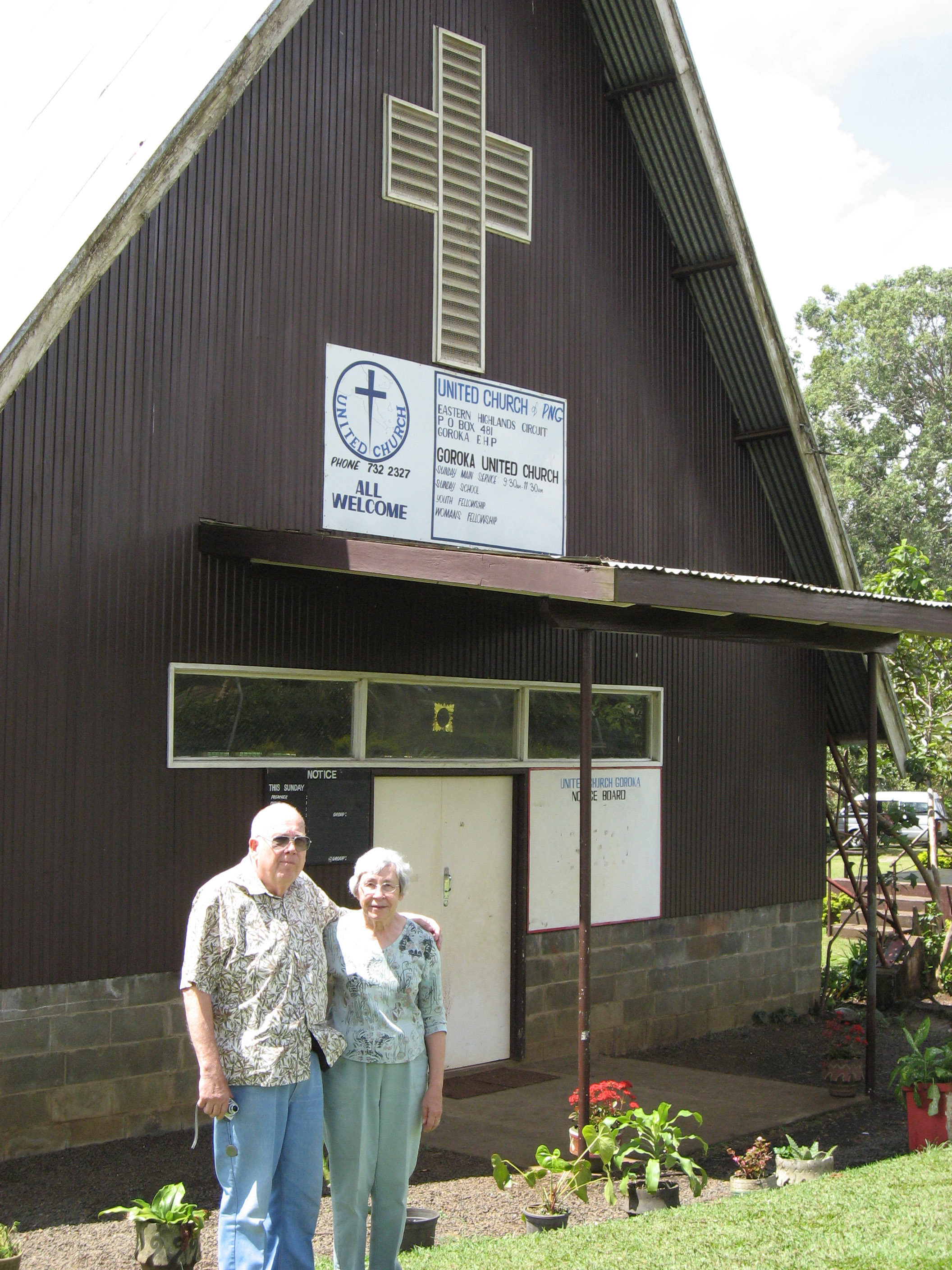 A close up of the sign on the church which reads, "United Church of PNG, Eastern Highlands Circuit, P.O. Box 481, Goroka EHP, Goroka United Church Sunday Main Service: 9:30am - 11:30am, ALL WELCOME".