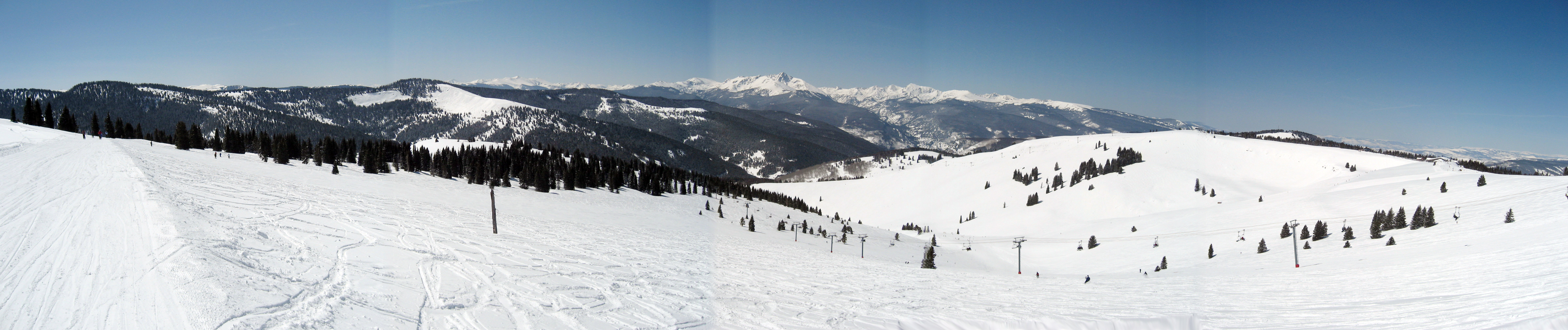 Use your horizontal scrollbar to see the entire panorama below (CLICK ON IT for a much larger version!) This is one of the famous "Vail Back Bowls", on a great day of sunshine and PLENTY of snow.