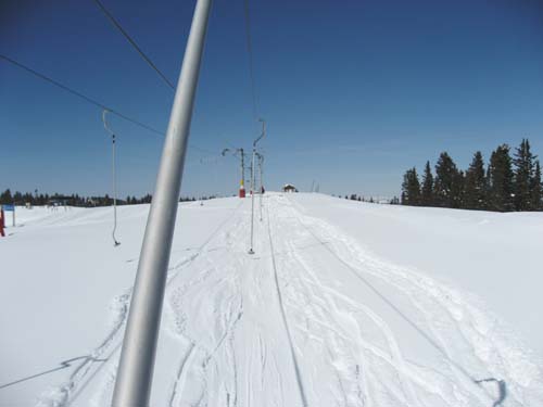 Here we are riding a Poma lift, which is a system that drags you along the snow so you don't have to walk. That's Garth Eliason behind me smiling into the camera.