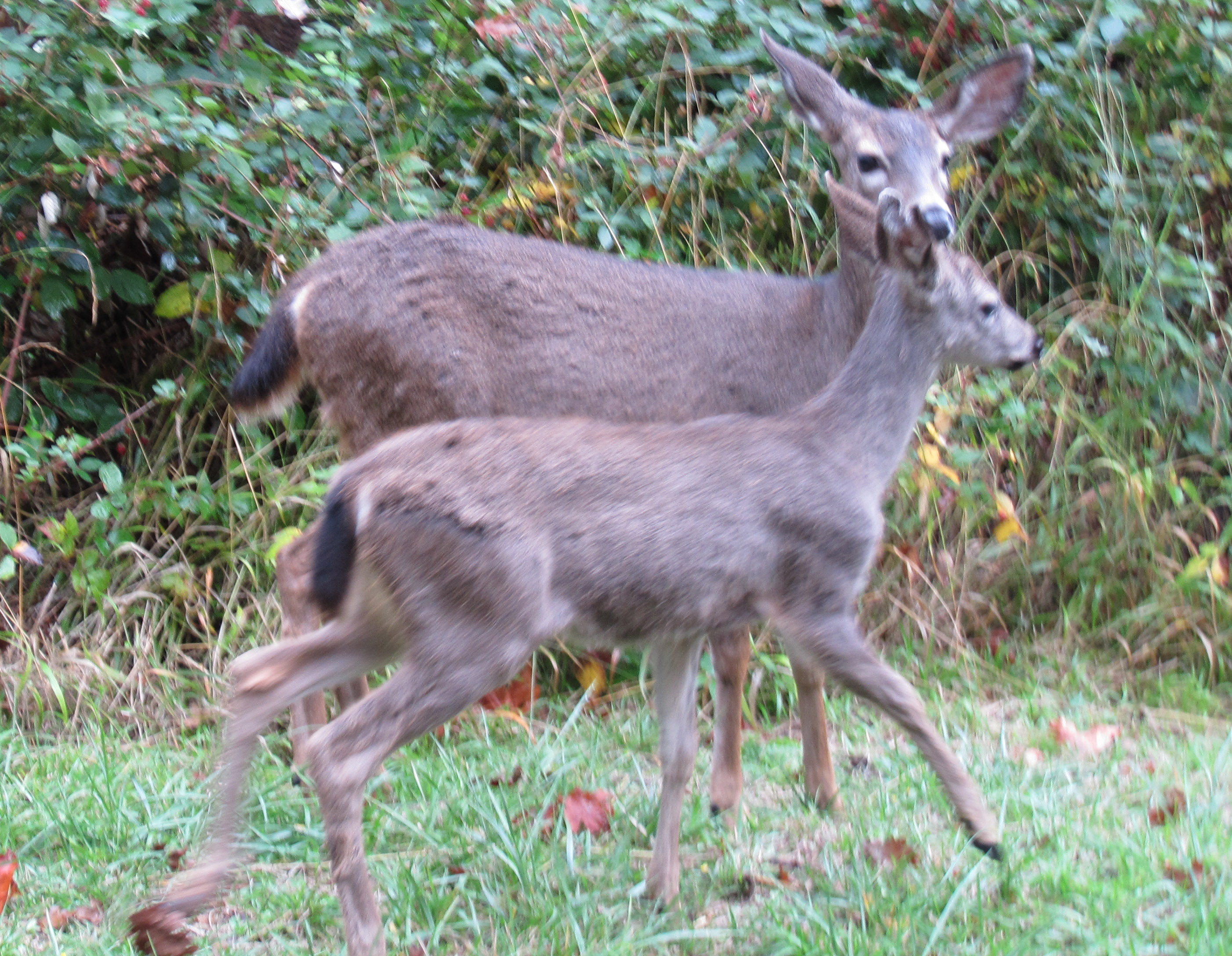 There are two deer in the picture below. The one on the right is a yearling buck (male deer) that has two fuzzy spike antlers.