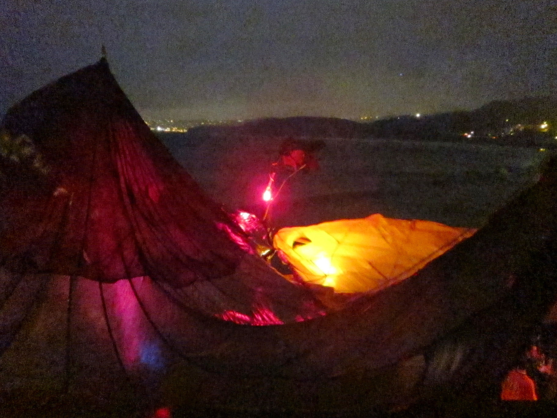 Below is a picture of the Burning Man style parachute tents setup on the party in advance, preparing for the raining and storming that occurred Saturday night. Picture taken from above.