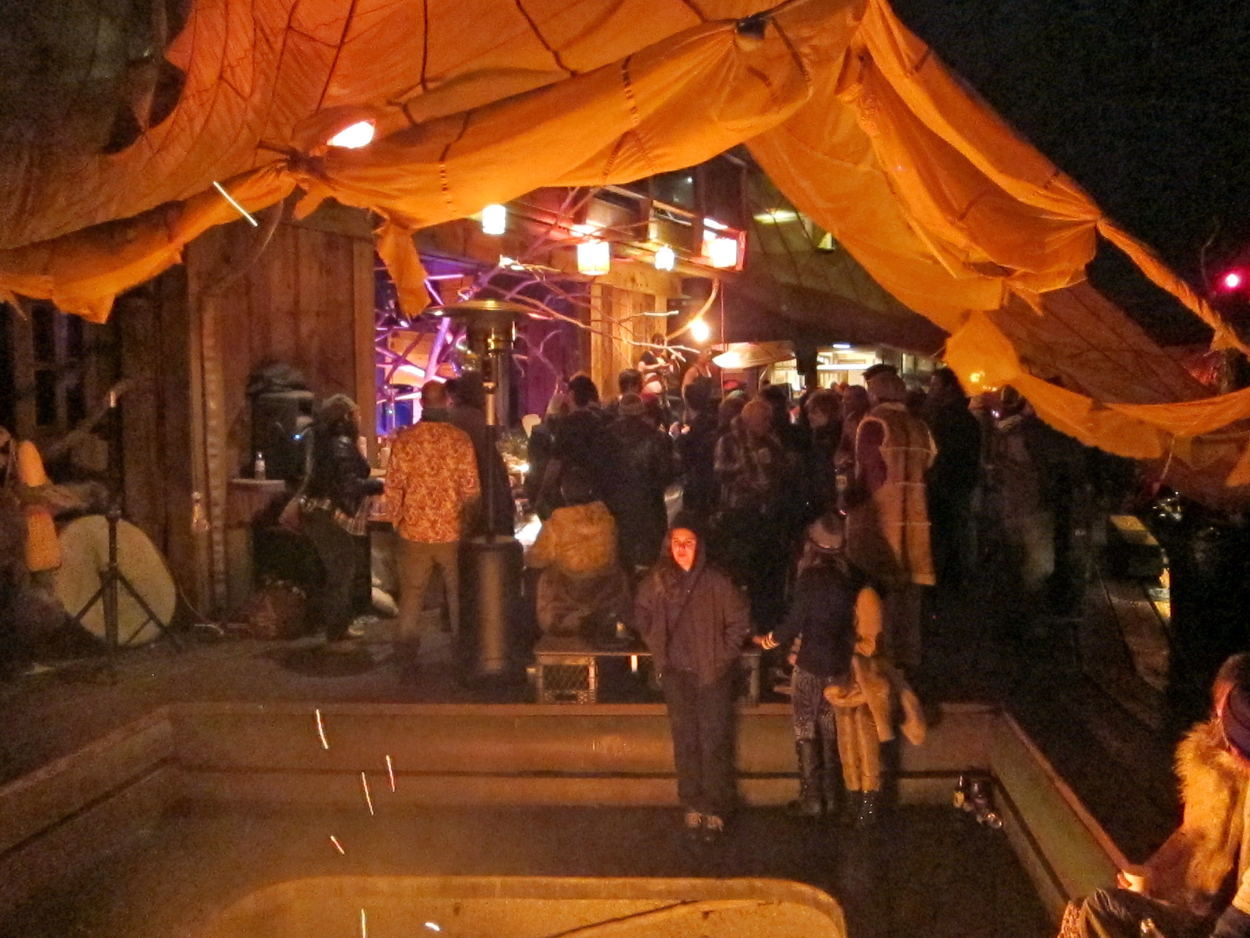 The DJs were setup in a decorated area (seen below) that was slightly protected from the rain and wind with heat lamps and an open walled building. If you look closely, that is a Macintosh Laptop as a core part of the DJ's equipment.