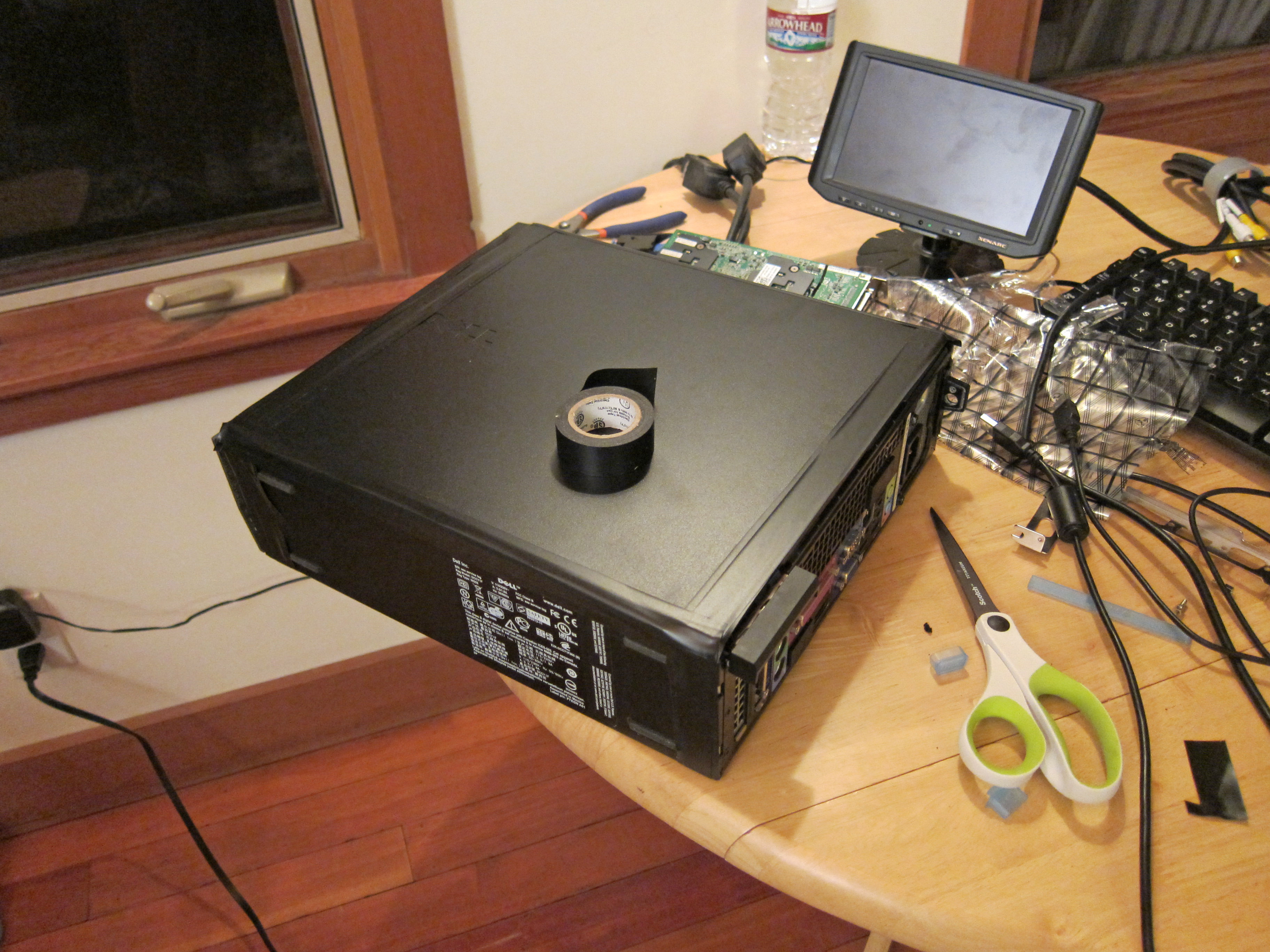 In the picture below the Dell 980 is completely closed up. Since I can't quite close the lid properly, I used electrical tape around the edges to seal off the 1/4" gap and keep everything in place. I was careful not to block any ventilation holes, but I wanted to close up any gaps so that the original ventilation of the computer would work as close to design as possible.