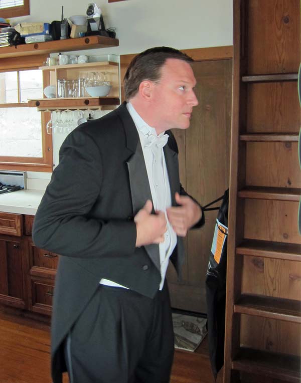 Fully dressed in rental clothing, out on the front porch of my house. I look like a butler.