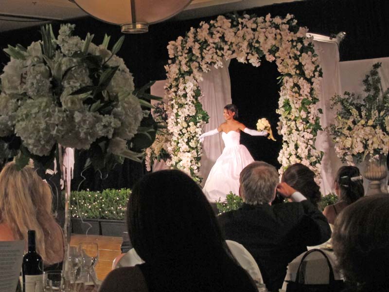 Now each Debutante is introduced. They start by being announced in the big flowery head stage seen below, where all alone they stand and do a curtsey. Their presenter then shows up and walks them around the room.