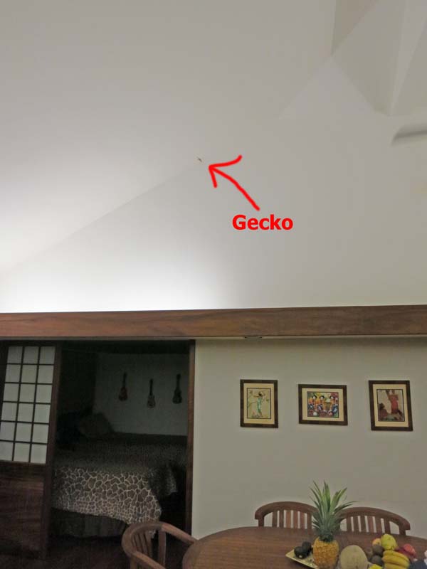 We rented a house through VRBO (Vacation Rental By Owner). Here is the link to our property, which was at 4890 Hale Emmalani, Princeville, Kauai. It was nice, with a "lap pool" in back and very spacious, outfitted well for guests. A friendly gecko we decided was our house pet was seen here and there in the house, below he is in the bathroom on the wall.