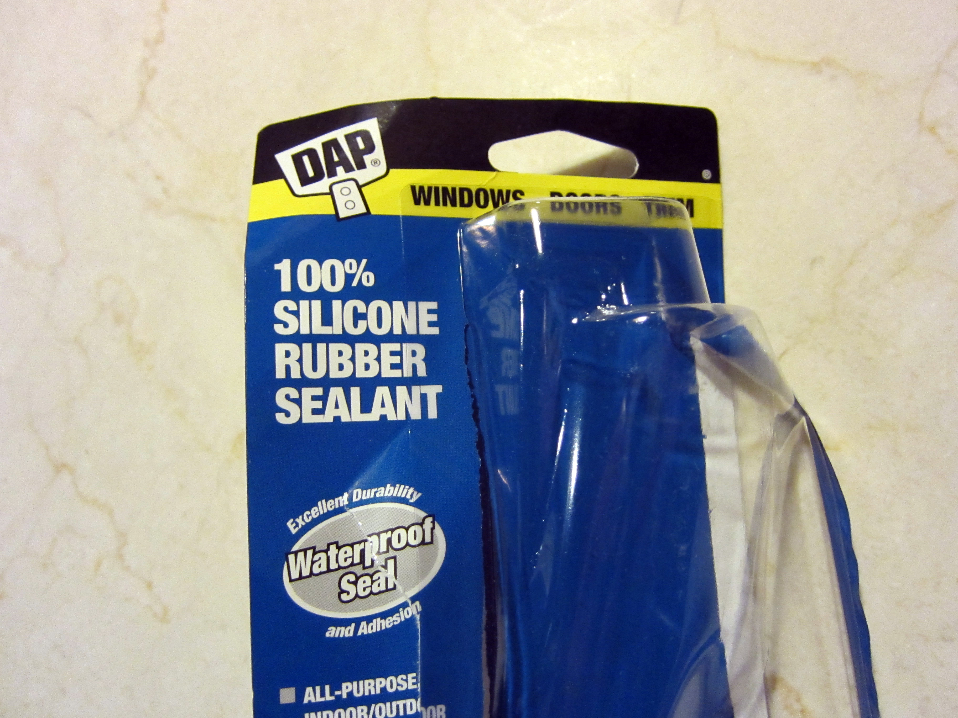 Ok, so the plan is to put the Dropcam peeking out the hole, and "airtight seal" it with 100 percent Silicone. IMPORTANT NOTE: Rubber cement ruins acrylic!! Only use 100 percent silicone. Below is the brand of Silicone in a small tube I picked up at the local hardware store.