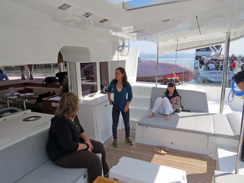 We board "L'Obsession" and hang out on the front of the catamaran.