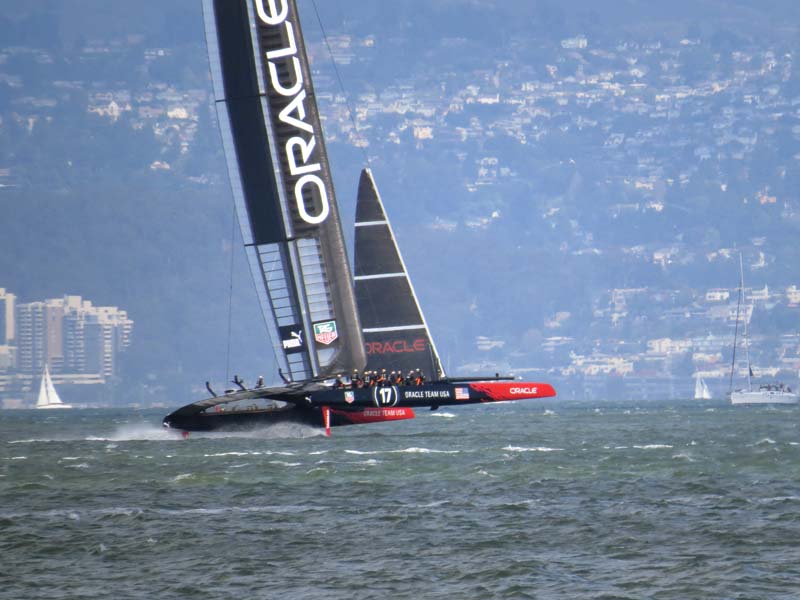 Below the America's cup boat has lifted all the way up onto both hydrofoils and is running along probably at 40mph or faster.