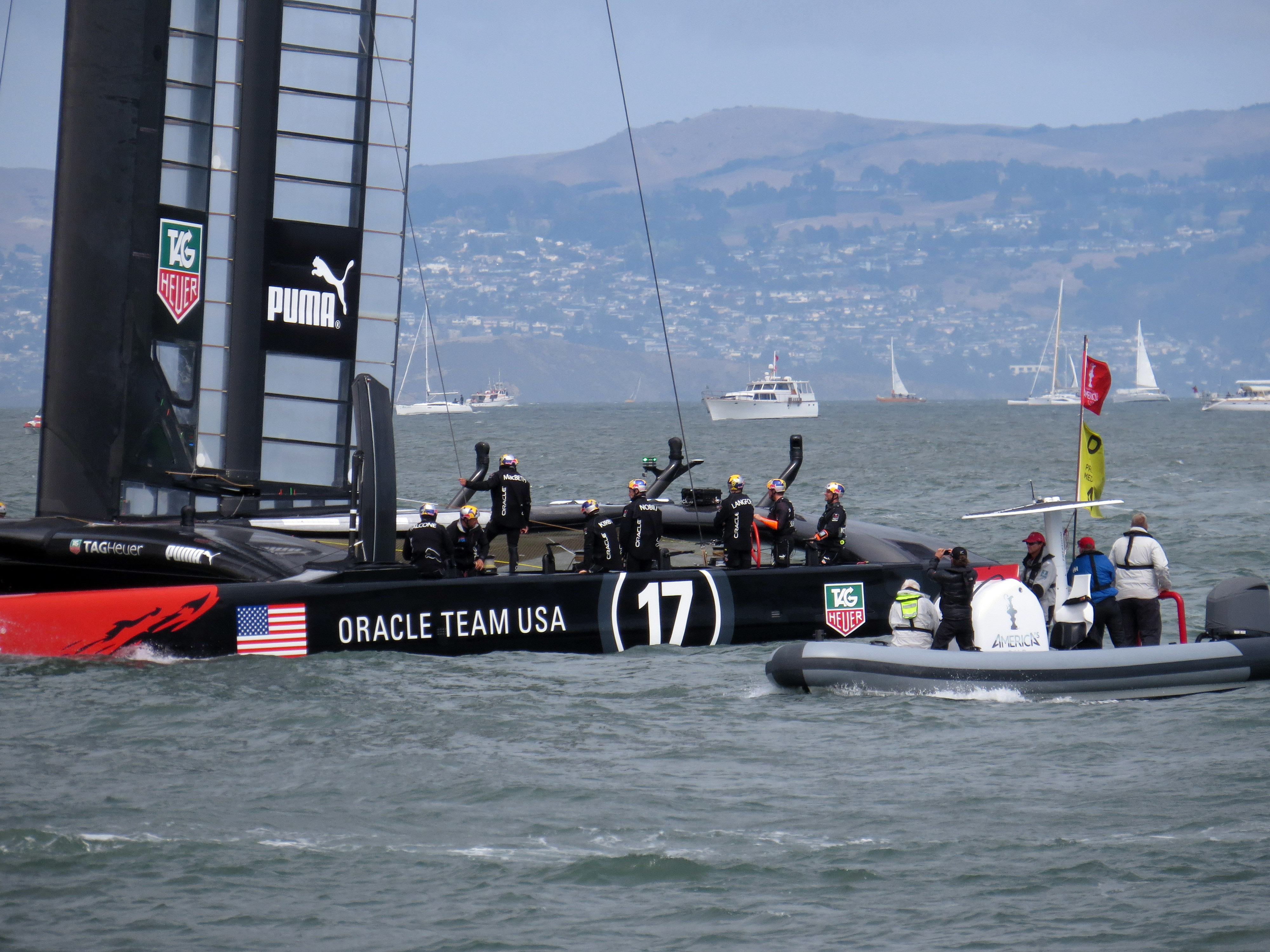 We were going about 10 mph home, when the Oracle boat came up on us doing maybe 40 mph. They had to turn to miss us. (They weren't racing, just goofing around in the bay at this point.)