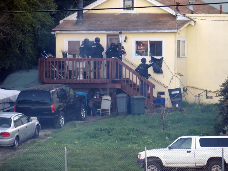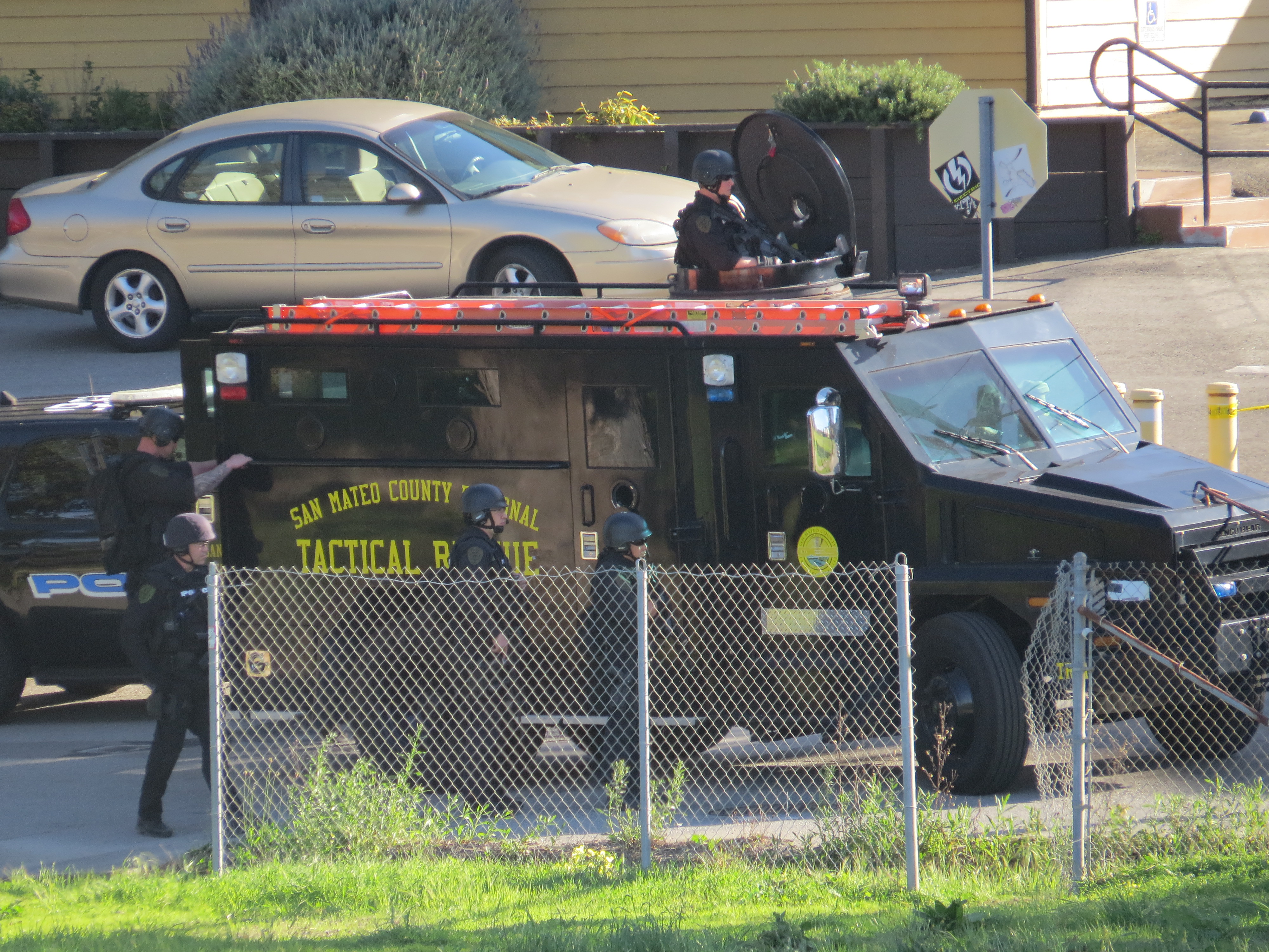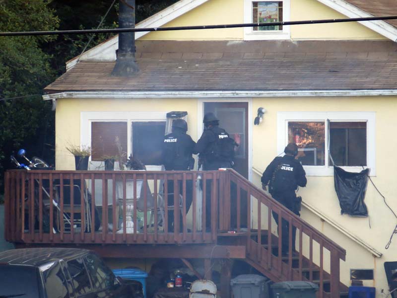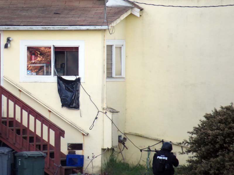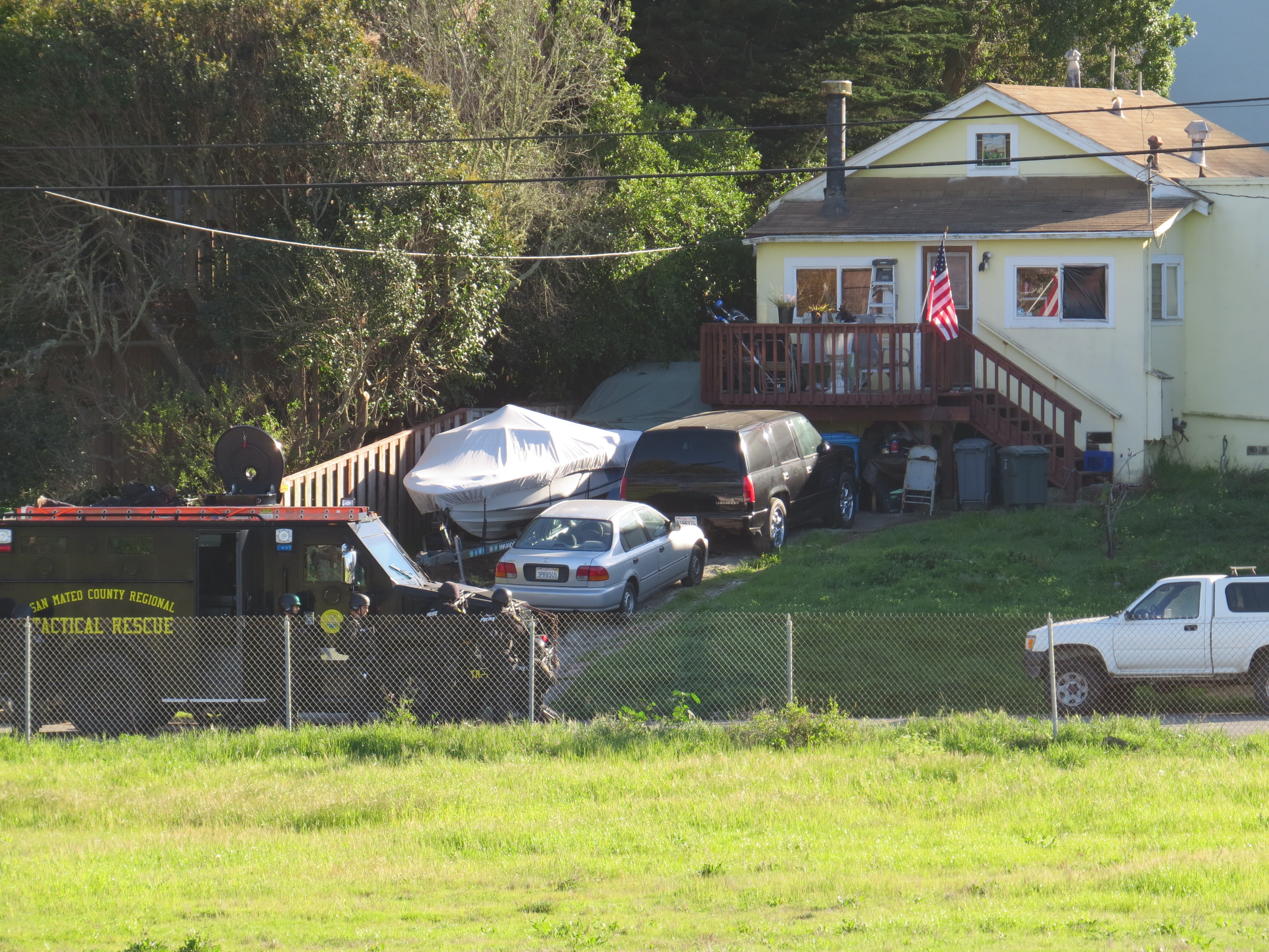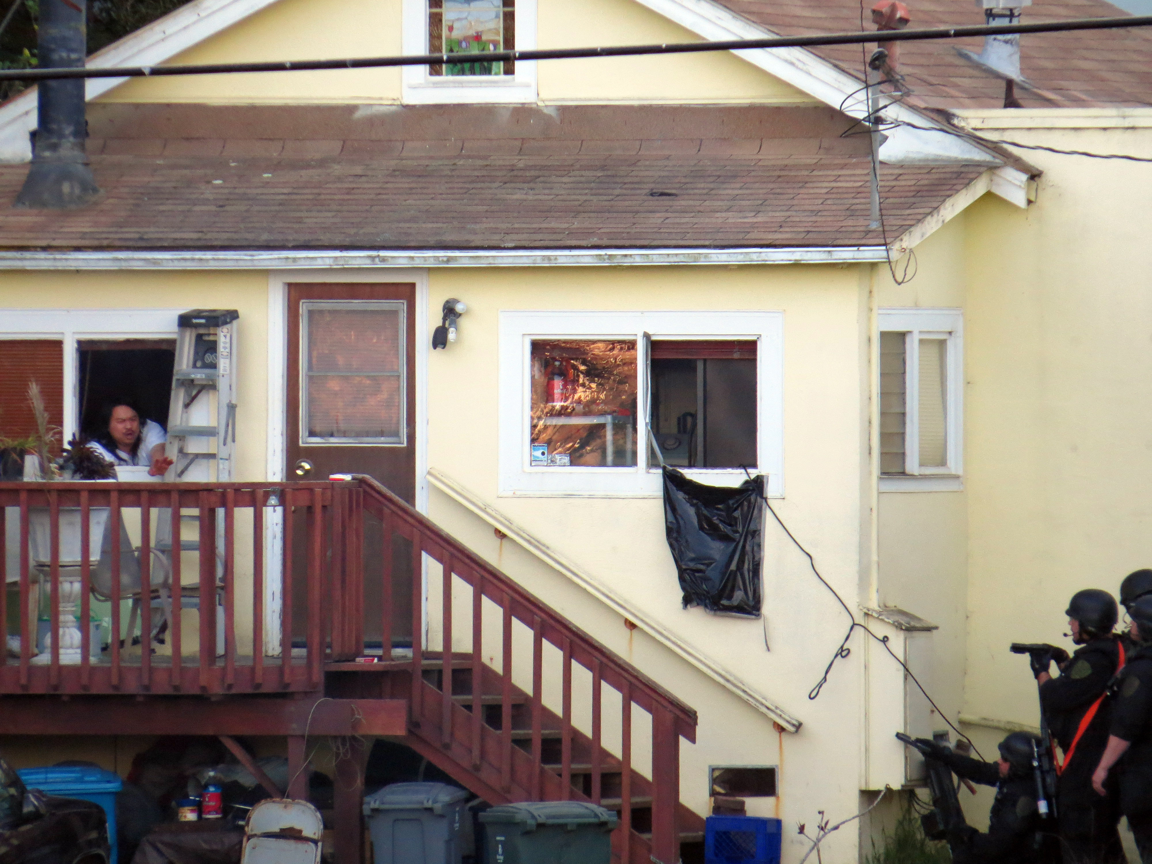 On March 18, 2014 there was a police standoff for more than 6 hours in Pacifica at the 300 block of San Pedro Avenue (on Pedro Point) in Pacifica, California. These pictures were taken with the people taking pictures handing the camera around and standing on my property. The man barricaded inside had the name of Errol, and his family and police were in front of his house by 12:20pm at least, and it all ended around 7pm when they shot and killed Errol. Click Here for a new story about it (sfgate.com). Click here for yet another news story (San Mateo County Times). Click here for an interview with Errol's brother (San Jose Mercury News).
