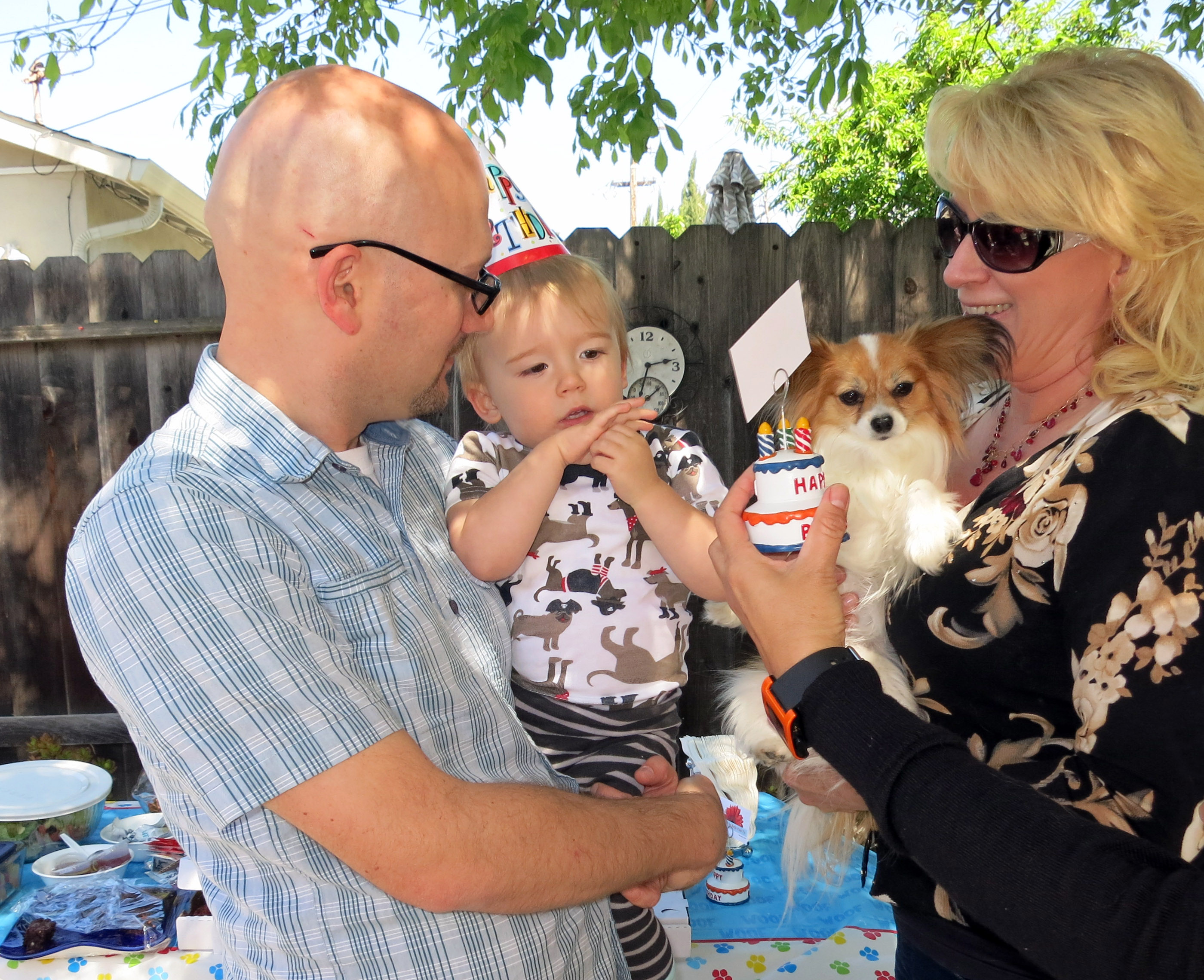 Human guests at the party, from left to right Cyrus, Sophie, Monika Gorkana, Adam Nelson, Kristen Nelson (facing away), Catherine Calarco (holding Belle the birthday dog).