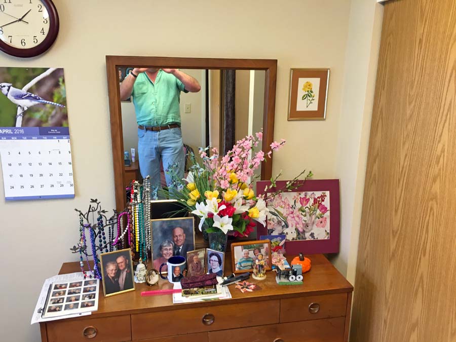 Post Mortem: three days after Katherine and I left, Randy and Ramey came to visit and helped Mom move AGAIN but just down the hallway (a private room with private bathroom opened up). Here is a picture in Mom's newer freshest room with private bathroom. Notice we arranged the room yet again to match her old room.