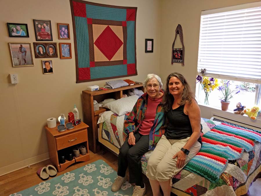 Virginia (my mom) sitting on her bed in the new apartment. Virginia has Alzheimer's and is a little stressed out at moving, but surprisingly willing to give this new apartment a try. She can't remember much, and cannot process much, and is just worried about whether she can figure everything out here. We reassure her that there are people here to help her. The saddest tragedy of dementia is that we cannot "get through" to Virginia to simply relax and enjoy this permanent vacation. Virginia is worried that she doesn't know enough to do everything "correctly" here, even though there is no "correct" and they take care of everything.
