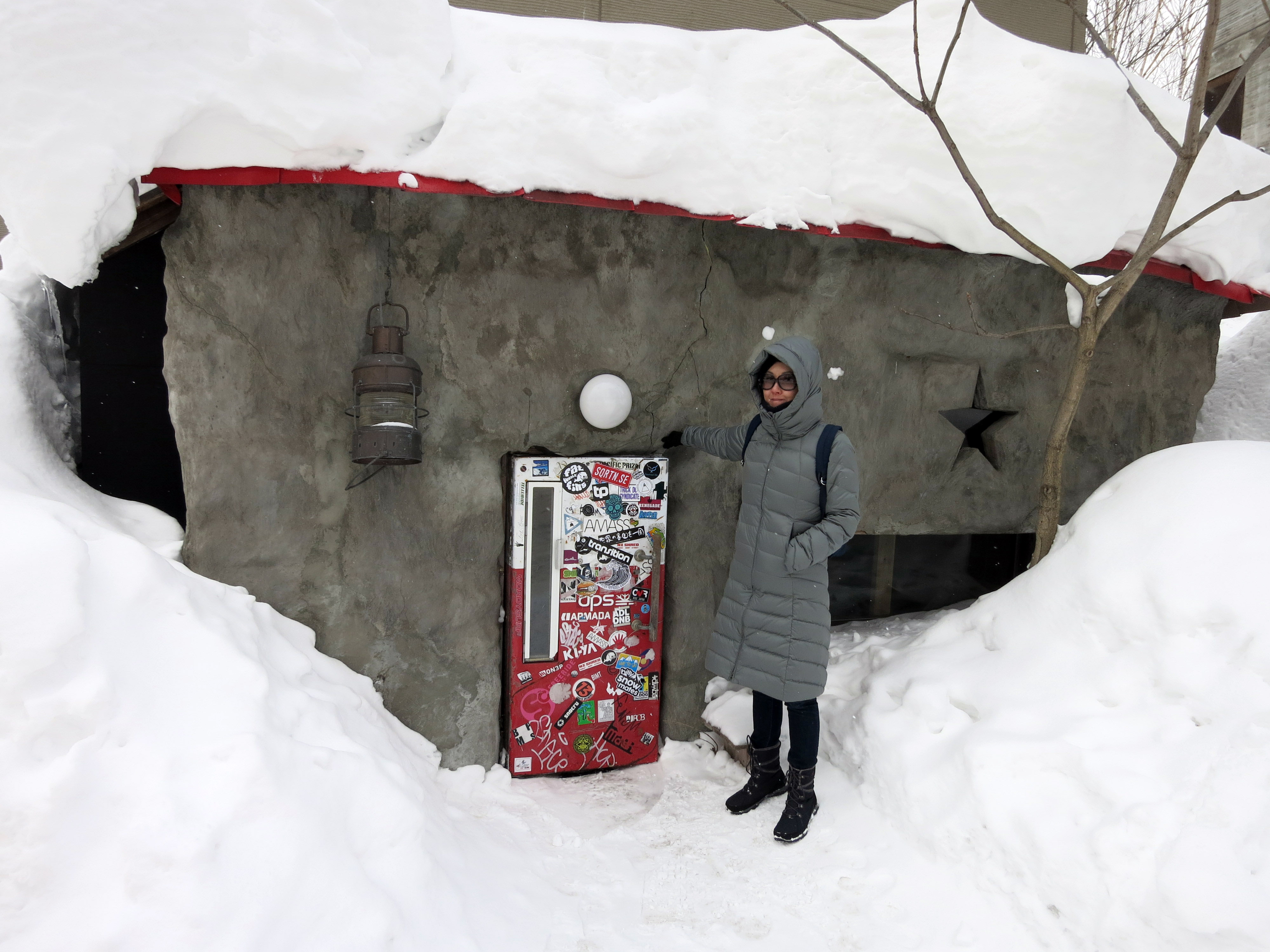 So we wanted to make sure to stop at the famous "Bar Gyu+" in Niseko. It is most famous for the entrance being an old refrigerator door about 4 feet high. Below Katherine poses in front of it (during an earlier day scouting visit) to give you an idea of scale. That really is the only entrance to the front of this bar.