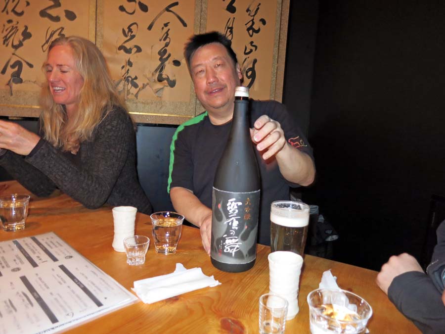 Lise and Mike. Mike has a very large bottle of Japanese Sake (rice wine) to pour for us.
