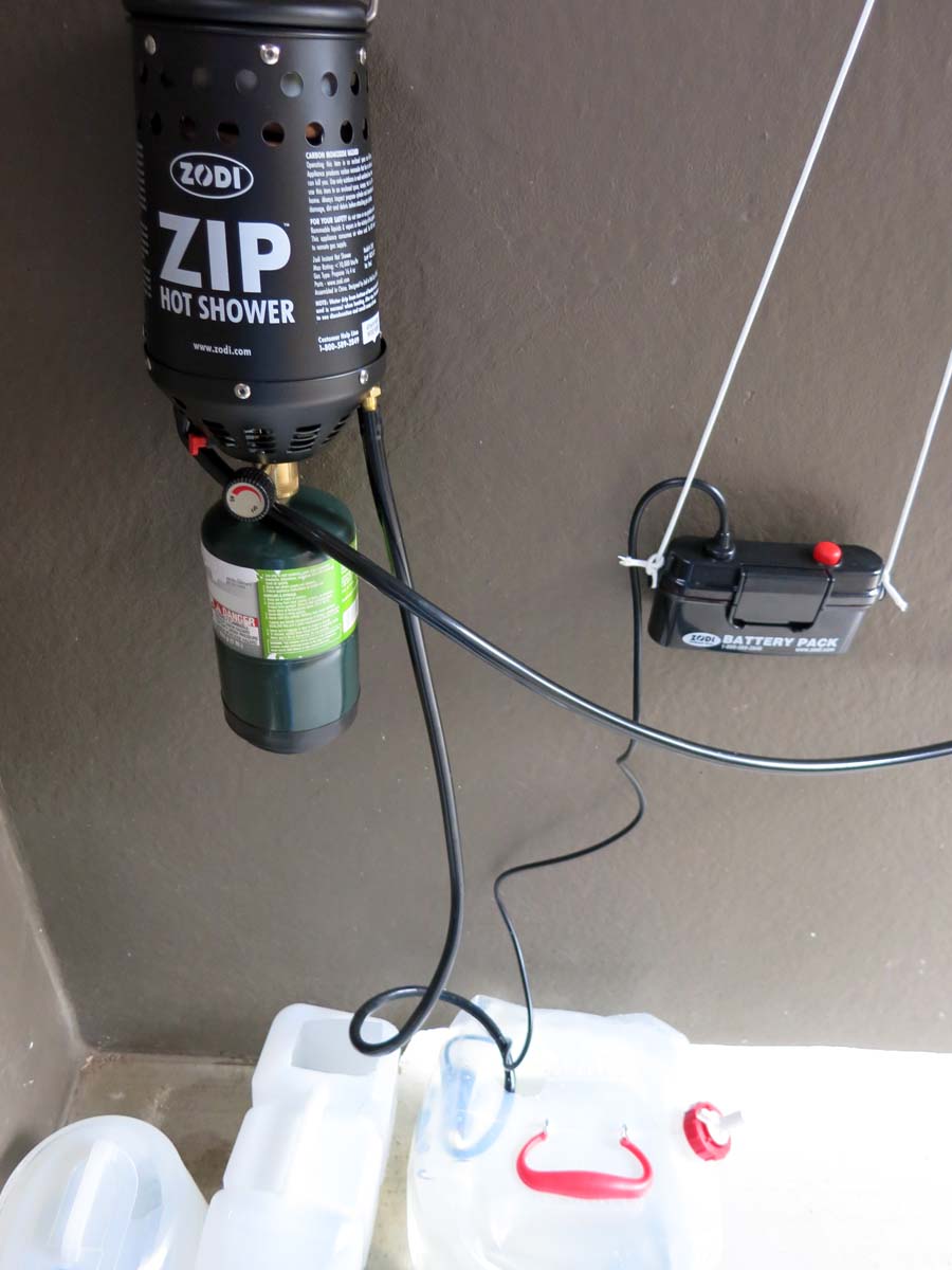 In Cabela's I noticed this "Zodi ZIP Hot Shower" and bought it. Here is a link on Amazon but I bought it in Cabela's for less. I set it up, and it worked "kind of Ok" for a shower.