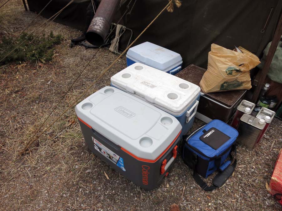 Every year I buy a new cooler at Cabela's and leave it with the hunting supplies. :-) I need it to fill with ice for camp, and don't have any way to get it home. The three on the left might all be ones I've contributed over the last 6 years. :-)