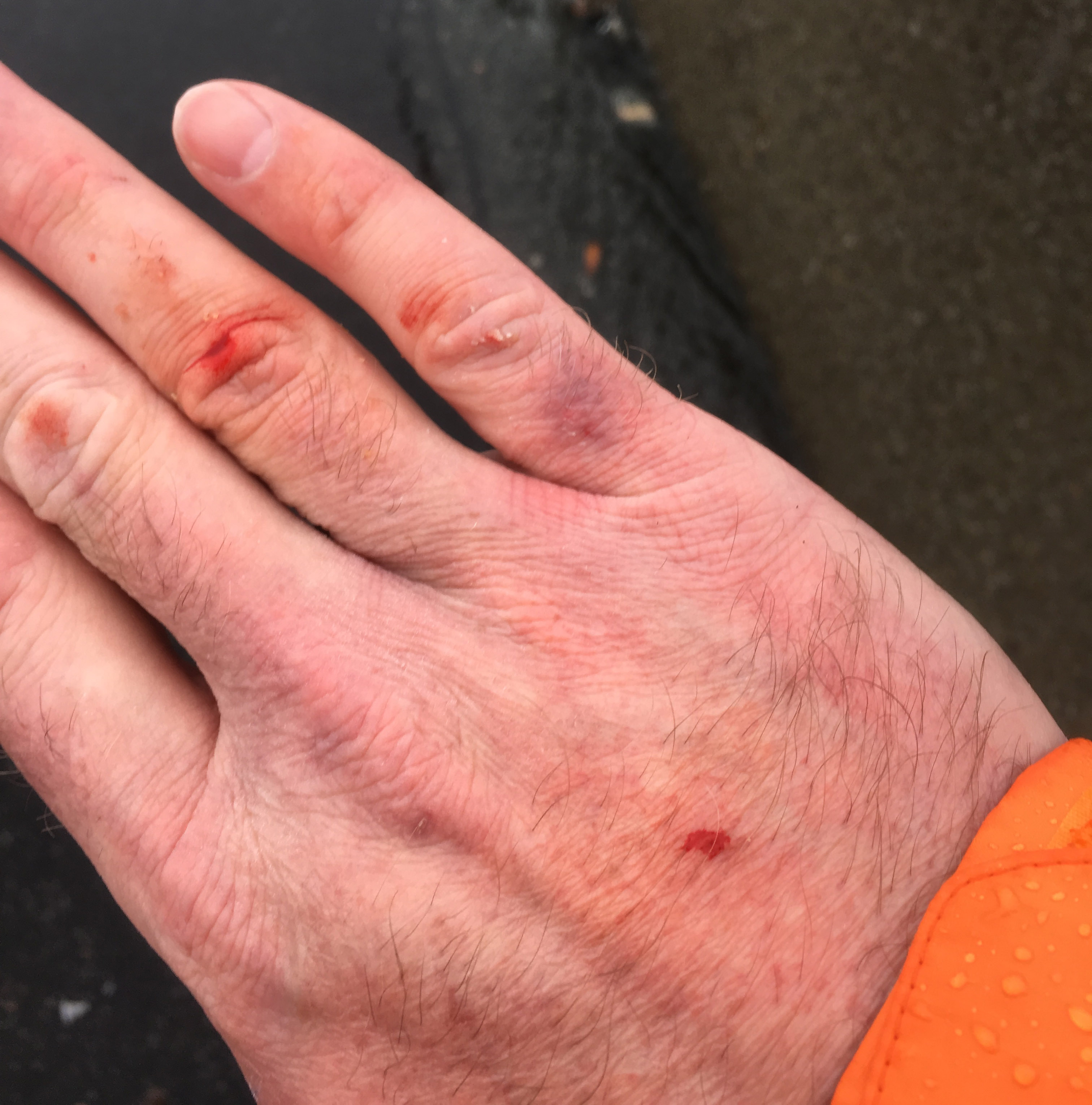 My right hand had a tiny amount of blood from superficial skin cuts.